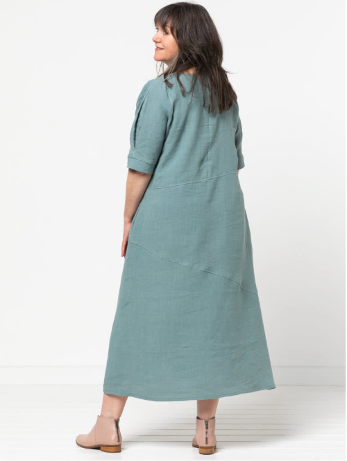 The dress has a flattering A-line shape and a chic boat neck. Its standout feature is the asymmetrical design lines that add visual interest and modern flair to the bodice and skirt. Students will learn how to accurately construct these unique seams. The pattern offers versatile styling with options for either a sleeveless finish or an elbow-length sleeve with a cuff. The closure is a delicate and secure loop and button back neck closure. You will also have the option to include practical inseam pockets.