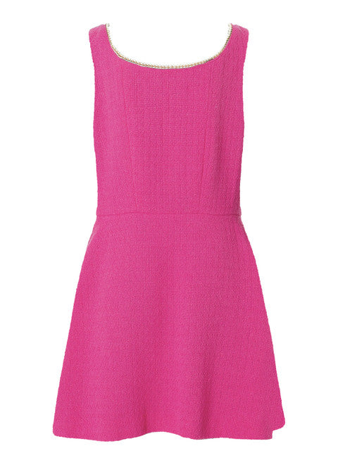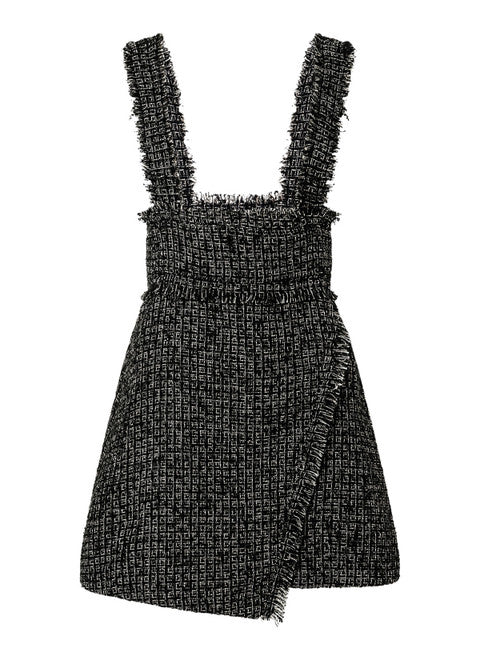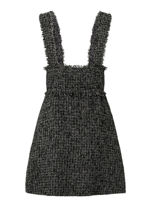 This beginner-friendly dress and skirt pattern set includes a chic tweed dress with a neckline border, asymmetrical slit, and sparkly skirt buttons. The paired skirt features a wide waistband and raw fringe hem — elegant and easy to style with boots, turtlenecks, or casual tops.