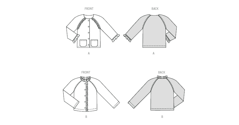 Sew two adorable jackets for kids with these beginner-friendly patterns. The first has raglan sleeves and charming ruffles at the hem and pockets. The second is a cozy sweat jacket featuring a ruffle along the neckline and front opening — ideal for using up colorful fabric scraps!