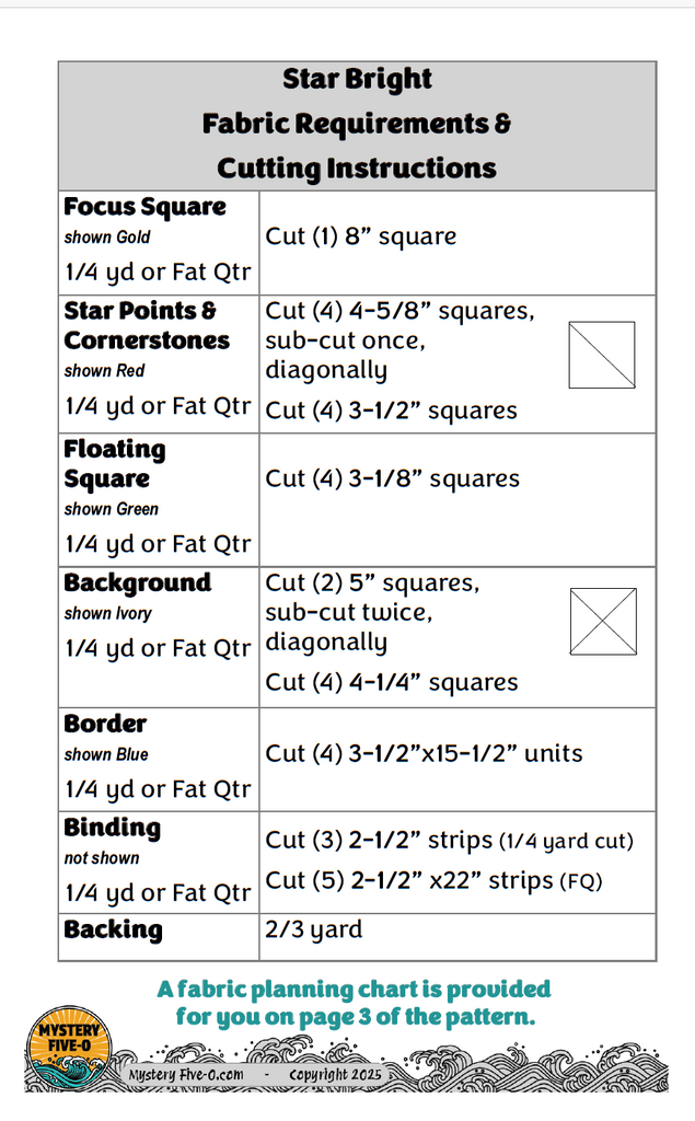 Pick any feature fabric, grab a six fat-quarters and let your starry wish come to life. Starbright was first introduced as a mini-mystery quilt in the Mystery Five-0 series. As a participating Mystery Five-0 retailer, we are able to offer this exclusive M50 pattern.
