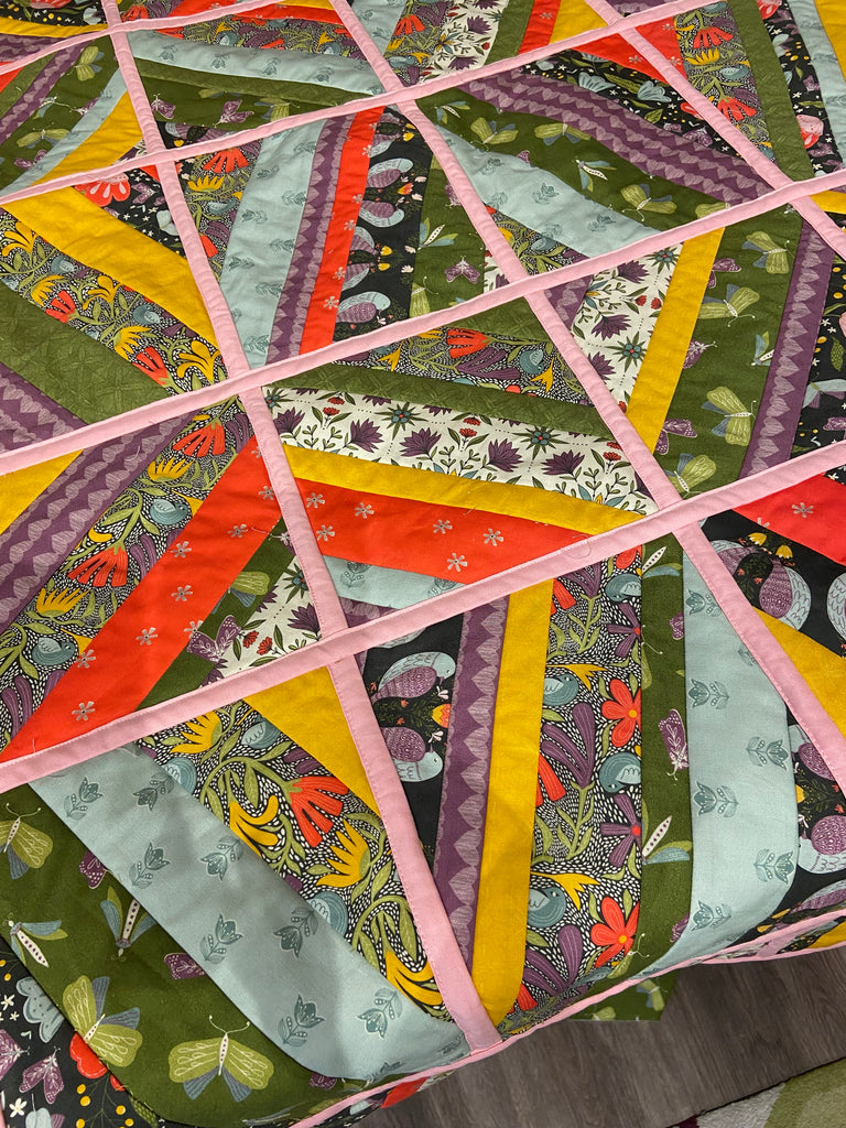 Use layer cakes, jelly rolls, or your fabric stash to orchestrate your room decor with this unique lap quilt and quilted cushion set. Sew-as-you-go easy, quick results, you'll make it again for a gift for a loved one. Uses one pack each 2 1/2" wide stirps, 1 1/2" wide strips and 10" squares.